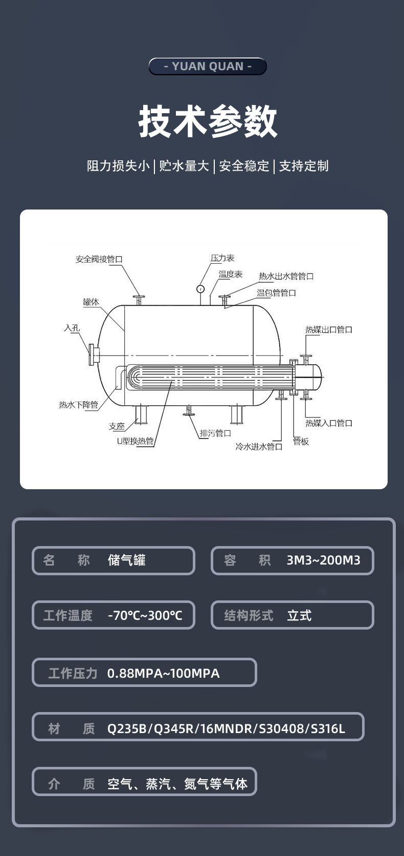 NANTONG YUANQUAN PRESSURE VESSEL CO.,LTD ALL RIGHT RESERVED. 南通源泉專(zhuān)業(yè)生產(chǎn)蒸汽蓄熱器、列管及螺旋板換熱器、儲罐、汽化冷卻裝置、水處理設備、化工設備等系列壓力容器產(chǎn)品